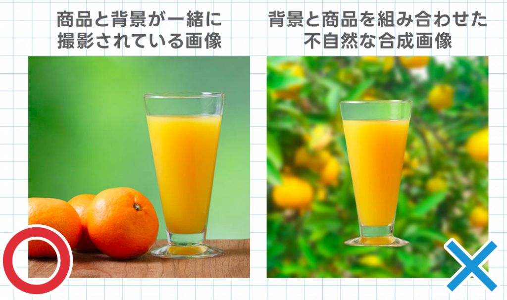 ただ、右の「みかんの木とジュースを合成した画像」これは一緒に撮影されているものではないので、ガイドライン違反になってしまいます。